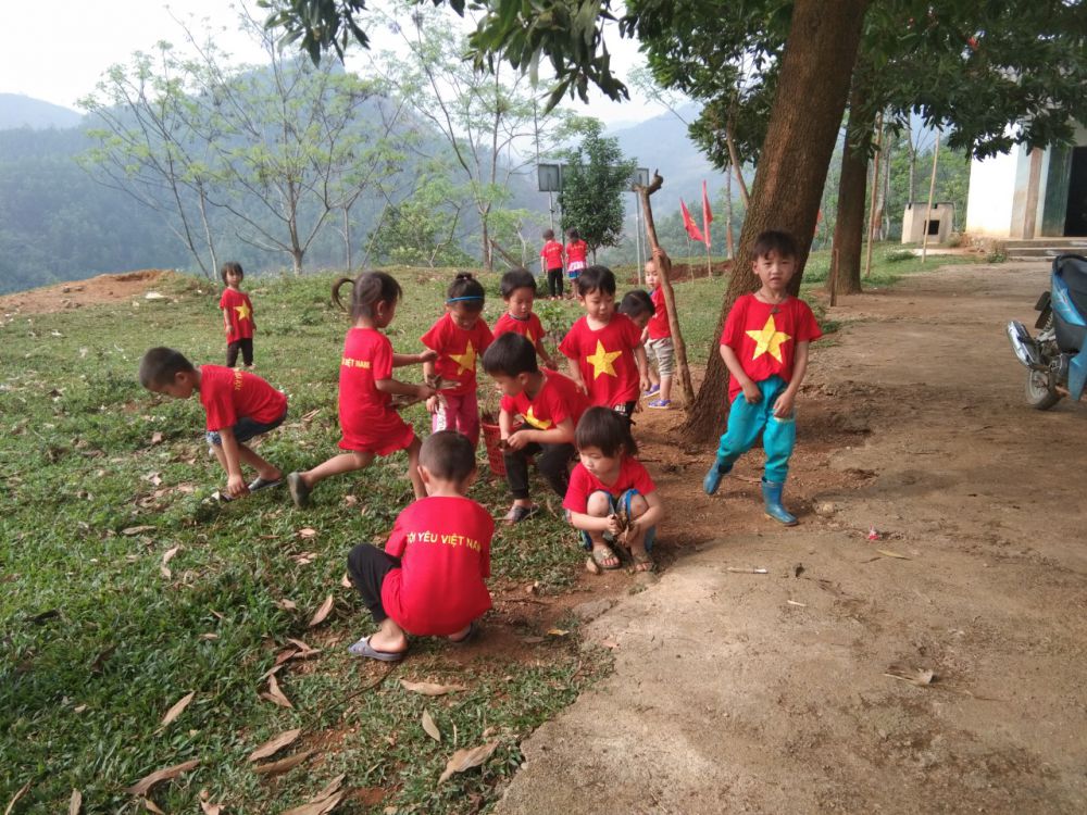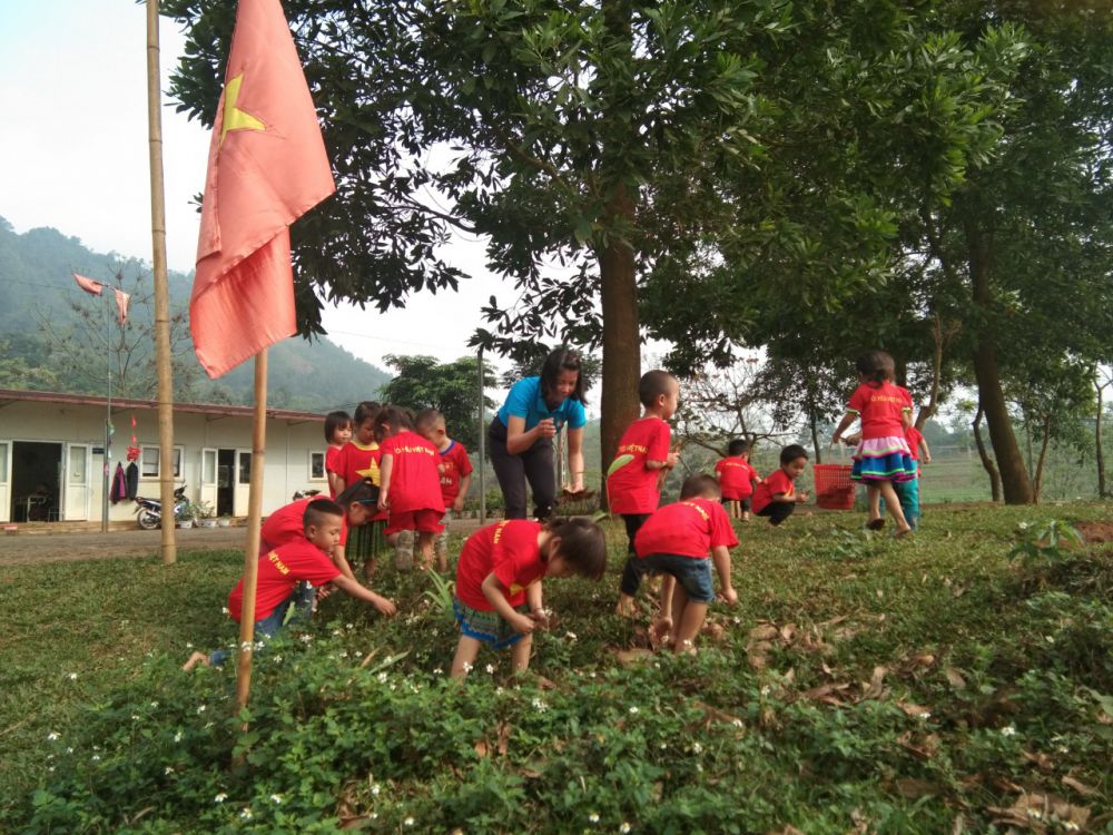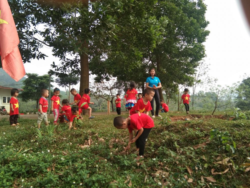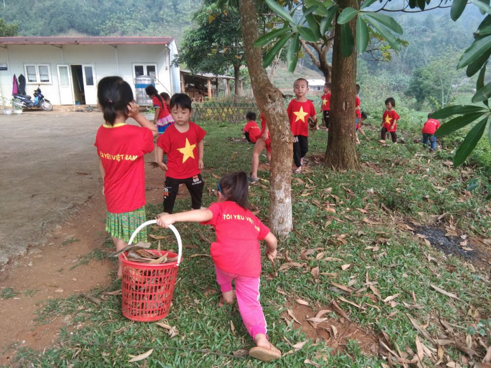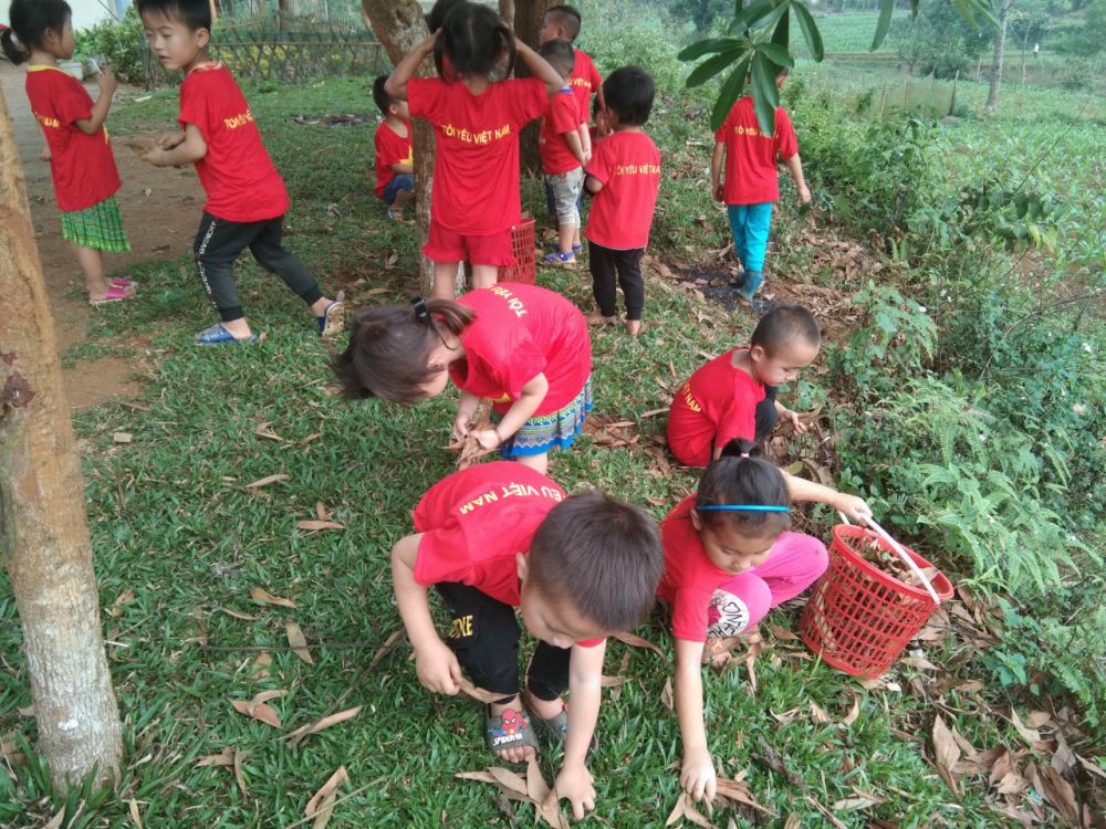 Lớp mẫu giáo ghép 5 tuổi điểm trường Pù Đồn trường Mầm non Đồng Tiến tổ chức cho trẻ lao động nhặt lá cây