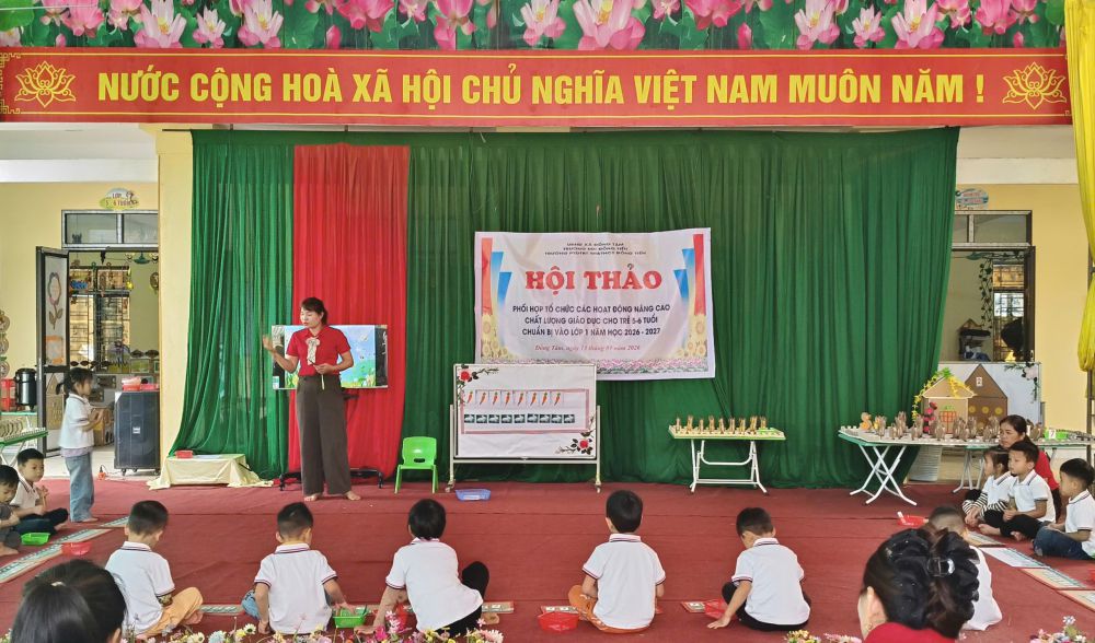 Thực hiện Công văn số 152/SGDĐT-GDPT ngày 16/01/2026 của Sở Giáo dục và Đào tạo tỉnh Tuyên Quang về việc phối hợp tổ chức các hoạt động nâng cao chất lượng giáo dục cho trẻ em 5–6 tuổi chuẩn bị vào lớp 1 năm học 2026–2027, sáng ngày 13/3/2026, Trường Mầm non Đồng Tiến đã phối hợp với Trường PTDTBT TH&THCS Đồng Tiến tổ chức Hội thảo và các hoạt động chuyên môn nhằm nâng cao chất lượng giáo dục trẻ 5–6 tuổi chuẩn bị vào lớp 1 năm học 2026–2027.